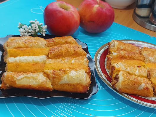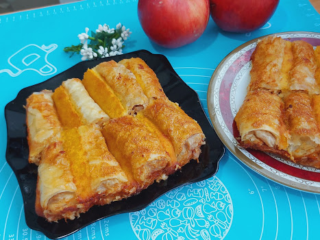 Raširiti koru, pa je premazati uljem. Staviti drugu koru preko nje i nju pouljiti. Na dno staviti 3 pune kašike jabuka, rasporediti, saviti ivice i čvrsto uviti u rolnicu.