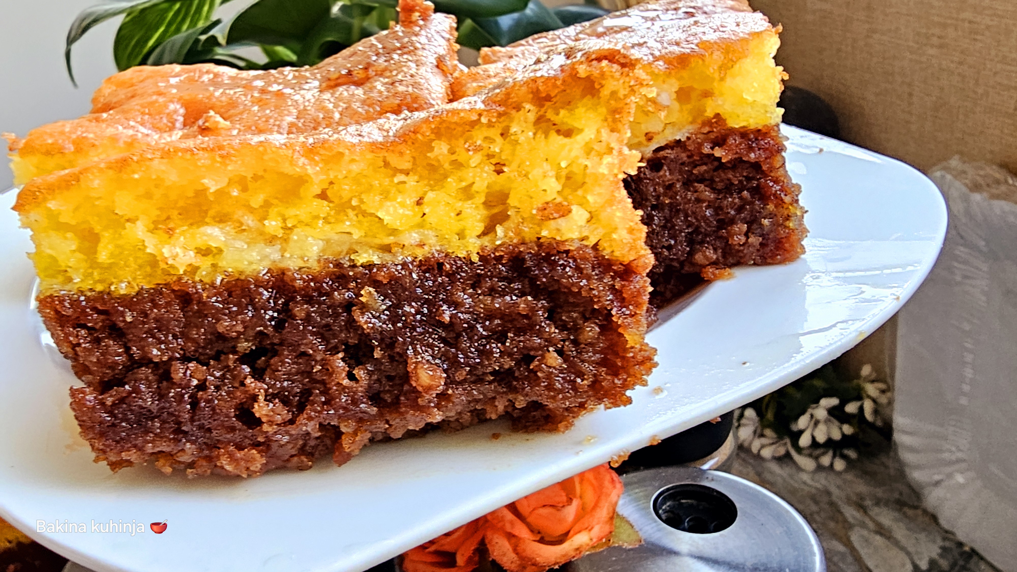Ubaciti ulje i koricu limuna i sve izjednačiti. Izvadi kolač iz rerne, pa preliti preko čokoladnog dela i peći još 30 minuta. Malo ohladiti, pa iseći na kocke.