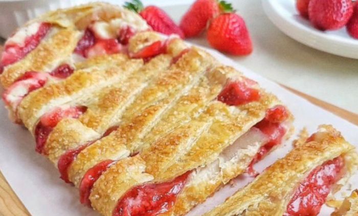 Bitno je da deo testa na koji ide nadev izbockate viljuškom, a ostatak testa ne. Zatim stavite krem sir, pa preko njega namažite malo pekmeza i na vrh naslažite jagode.