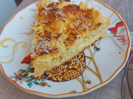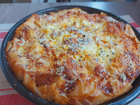 Ostatak nadeva premazati kore koje su išle preko ivice. Posuti susamom svetlim okolo, a crnim sredinu. Još malo pouljiti i peći na 200 stepeni oko 50-60 min. Seći toplo. Servirati uz čašu jogurta. Prijatno!