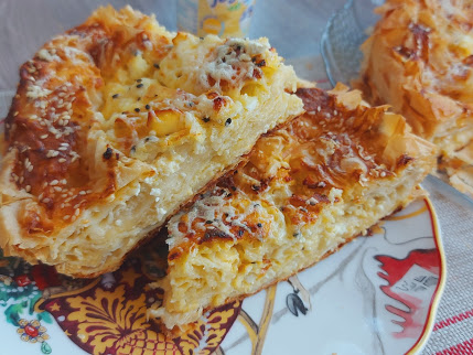 Ponovo zgužvati, dodati samo ulje, pa opet u sredinu staviti kore, pa nadev i tako redom dok se ne potroši sve. Ostatatak nadeva istresti na sredinu i na vrh još malo namrviti sira, Ivice saviti ka sredini, ali ne pokrivati već ih malo saviti tako da se sredina sa nadevom vidi.