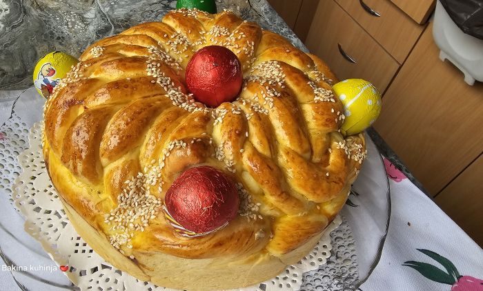 Od ostatka testa izvaljati valjak i uviti u pletenicu. Staviti oko prethodne pletenice do ivice pleha. Od folije napraviti manje loptice, pa ih premazati uljem, pa jednu staviti u sredinu, a ostale 4 na ivicu pogače u obliku krsta. Kad pogača odmori i poraste premazati žumancetom.