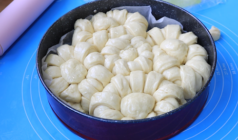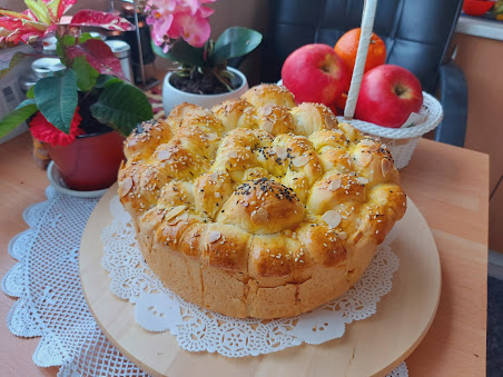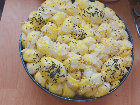 Ređati u okrugli pleh 28 cm prečnika koji ste podmazati uljem. Pogaču odmoriti pa je premazati sa žumancetom u koji ste stavim kašiku mleka i malo maslinovog ulja. Posuti susamom i krupbnom solju. Peći na 180 stepeni 50-60 minuta.