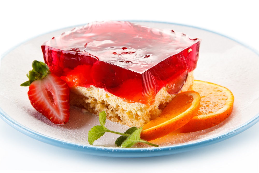 Sklonite sa vatre i umešajte crveni želatin koji ste prethodno rastopili u vodi. Ostavite desetak minuta da se preliv prohladi, pa ga sipajte preko belog fila i vratite u frižider da se dobro stegne.