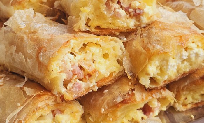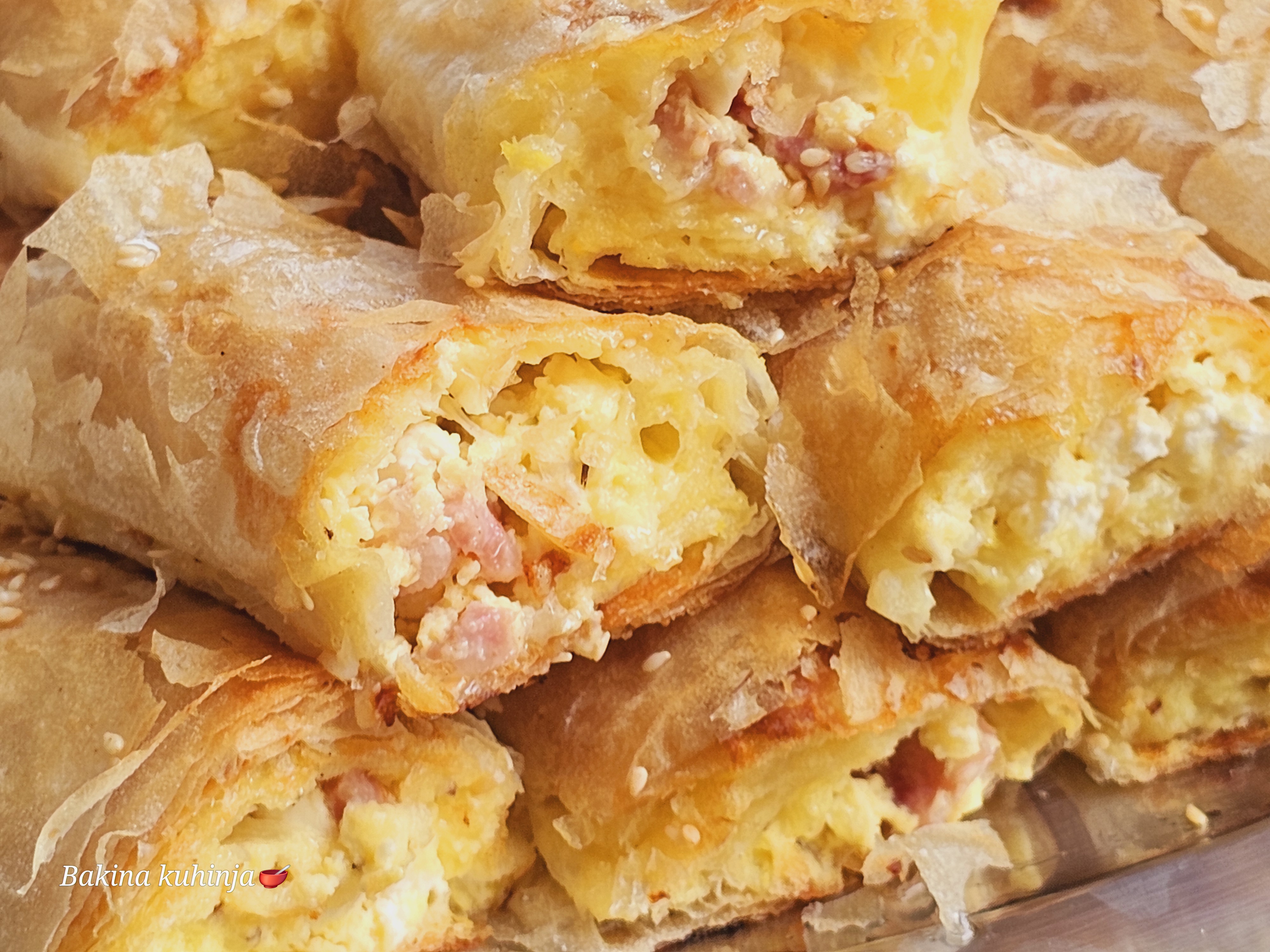 Sve izjednačiti. Dve kore premazati uljem, staviti jednu preko druge, a dve potopite u nadev sira zgužvane i stavite pri dnu. Saviti u rolat sve zajedno i ređati u pleh obložen pek papirom..