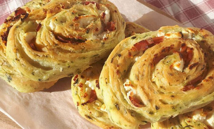 Ostavote testo na na toplom 15 - 20 minuta da nadolazi. Kao sto vidite ja sam na deo testa stavila pečurke, a ovaj drugi deo nije posan. Prstima izlomite fetu, naseckajte mortadelu i poređajte krugove sremske. Urolajte i secite na debljinu oko 2 cm.