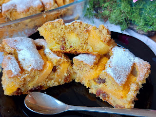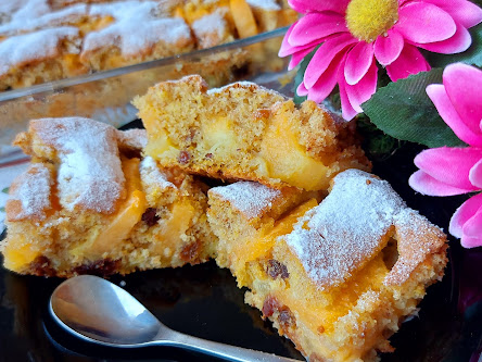 Poređati kriške dinja (može jabuke, kruške, kajsije, breskve). Peći na 200 stepeni C oko 50-60 min Fantazija od kolača.