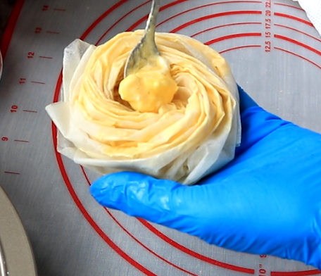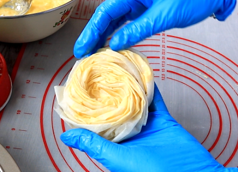 Pokriti malo po ivicama kora fil, pa ružitcu okrenuti naopako i u sredinu staviti fil i ređati u podmazan okrugli pleh.