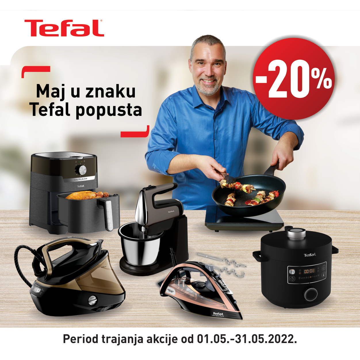 Iskoristite fenomenalnu akciju tokom maja. Tefal zajedno sa svojim partnerima kupcima poklanja popust od 20% za kupovinu malih kućnih aparata i Tefal posuđa.