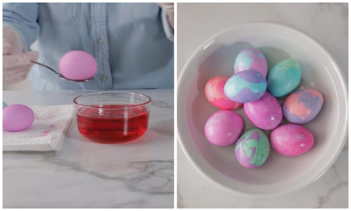 Skuvajte jaja. U plastičnu čašu razmutite boju za farbanje jaja u malo vode, dodajte malo sirćeta i stavite jaje tako da bude prekriveno samo dno jajeta. Ostavite jaje tako da odstoji oko 2 minuta, pa dodajte ponovo malo vode i sačekajte da prođe još dva minuta. Ponovo dodajte vodu i sačekajte da prođe dva minuta. Kada je celo jaje prekriveno, izvadite ga i videćete efekat. Kako dodajete vodu, intezitet voje se smanjuje postepeno i stvara se ombre efekat. Kada se jaje osuši, premažite ga uljem.