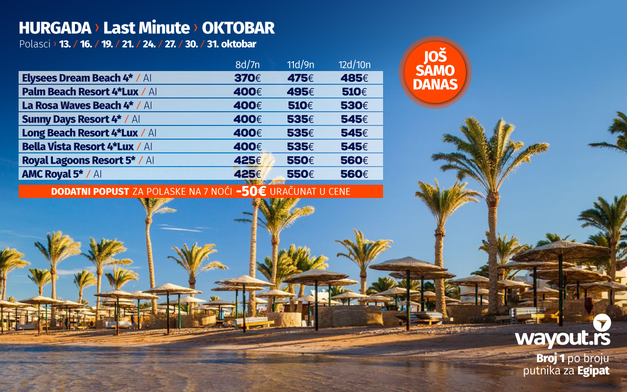 LAST MINUTE ponuda za Hurgadu je sastavljena od najtraženijih hotela sa neverovatno povoljnim cenama, najpovoljnijim do sada i preporučujemo putnicima da iskoriste ovu neodoljivu ponudu i otputuju na svoje dugo čekano putovanje i pobegnu od jesenjih dana na uvek sunčanu destinaciju kakva je Hurgada, gde će ih dočekati nadaleko poznata egipatska gostoljubivost i veoma kvalitetni hoteli.
