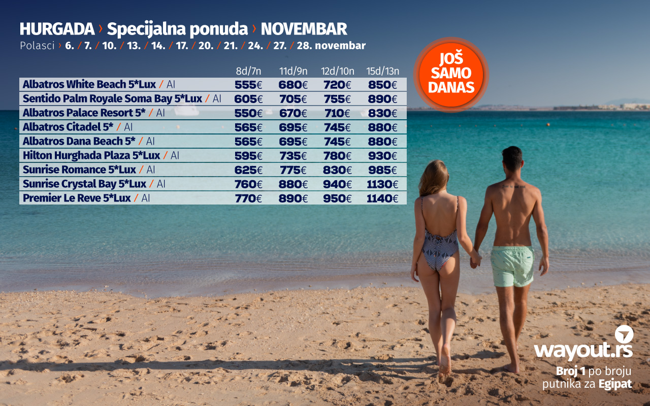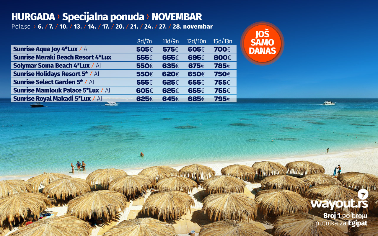Ukoliko još uvek niste stigli da rezervišete svoje putovanje, bez mnogo razmišljanja, definitvno, najsigurniji i najpovoljniji izbor ove jeseni je Hurgada i odmor na prelepim plažama Crvenog mora, a za sve one koji bi da što pre pobegnu od svakodnevnih obaveza, spremili smo neodoljivu LAST MINUTE koja se odnosi na poslednja mesta, kako u avionima, tako i u hotelima za polaske u oktobru, kao i SPECIJALNU PONUDU za polaske u novembru.