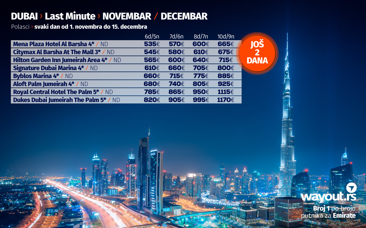 Kao što ste navikli prethodne jeseni i zime, uz neizbežan odmor na divnim plažama Arabijskog zaliva, preporučujemo putovanje u Dubai u oktobru po nikad povoljnijim LAST MINUTE cenama. Za naše putnike smo izdvojili neke od najpopularnijih hotela sa najpristupačnijim cenama, a Dubai svakako važi za jednu od najsigurnijih i najorganizovanijih destinacija koje su se među prvima oporavile i nastavile normalno funkcionisanje nakon pandemije, a ako ste navikli da svoje putovanje u Dubai rezervišete preko turističkih portala, proverite naše paket aranžmane koji uključuju avio karte, transfere na destinaciji, smeštaj u vrhunskim hotelima, kao i usluge licenciranog vodiča na srpskom jeziku i uverite se u to da su naše cene najpovoljnije uz maksimalno kvalitetnu uslugu.