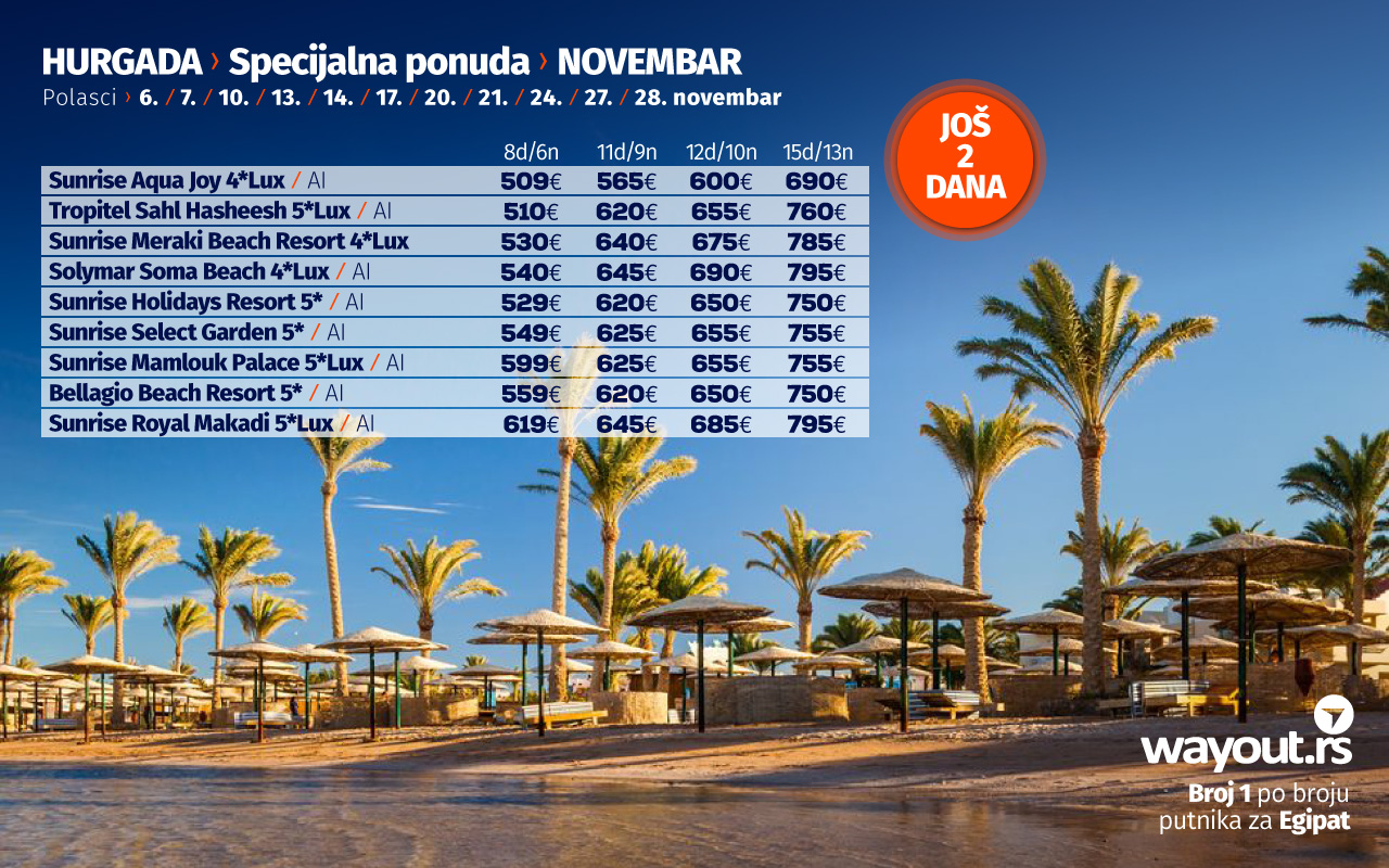 LAST MINUTE ponuda za Hurgadu je sastavljena od najtraženijih hotela sa neverovatno povoljnim cenama, najpovoljnijim do sada i preporučujemo putnicima da iskoriste ovu neodoljivu ponudu i otputuju na svoje dugo čekano putovanje i pobegnu od jesenjih dana na uvek sunčanu destinaciju kakva je Hurgada, gde će ih dočekati nadaleko poznata egipatska gostoljubivost i veoma kvalitetni hoteli.