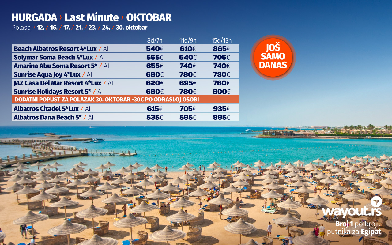 Takođe, posebno bismo napomenuli i novitet u Wayout ponudi, a to su aranžmani za Mini odmor u Hurgadi, bazirani na 8 dana / 7 noćenja u oktobru, sa polascima 9. / 16. / 23. / 30. oktobra u saradnji sa nacionalnom avio kompanijom Air Serbia kojoj dugujemo veliku zahvalnost na besprekornoj saradnji, a pre svega su ovi aranžmani namenjeni putnicima koji žele na kratko da odu iz grada ili jednostavno nemaju dovoljno slobodnih dana od godišnjeg odmora.