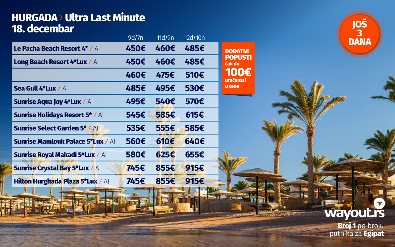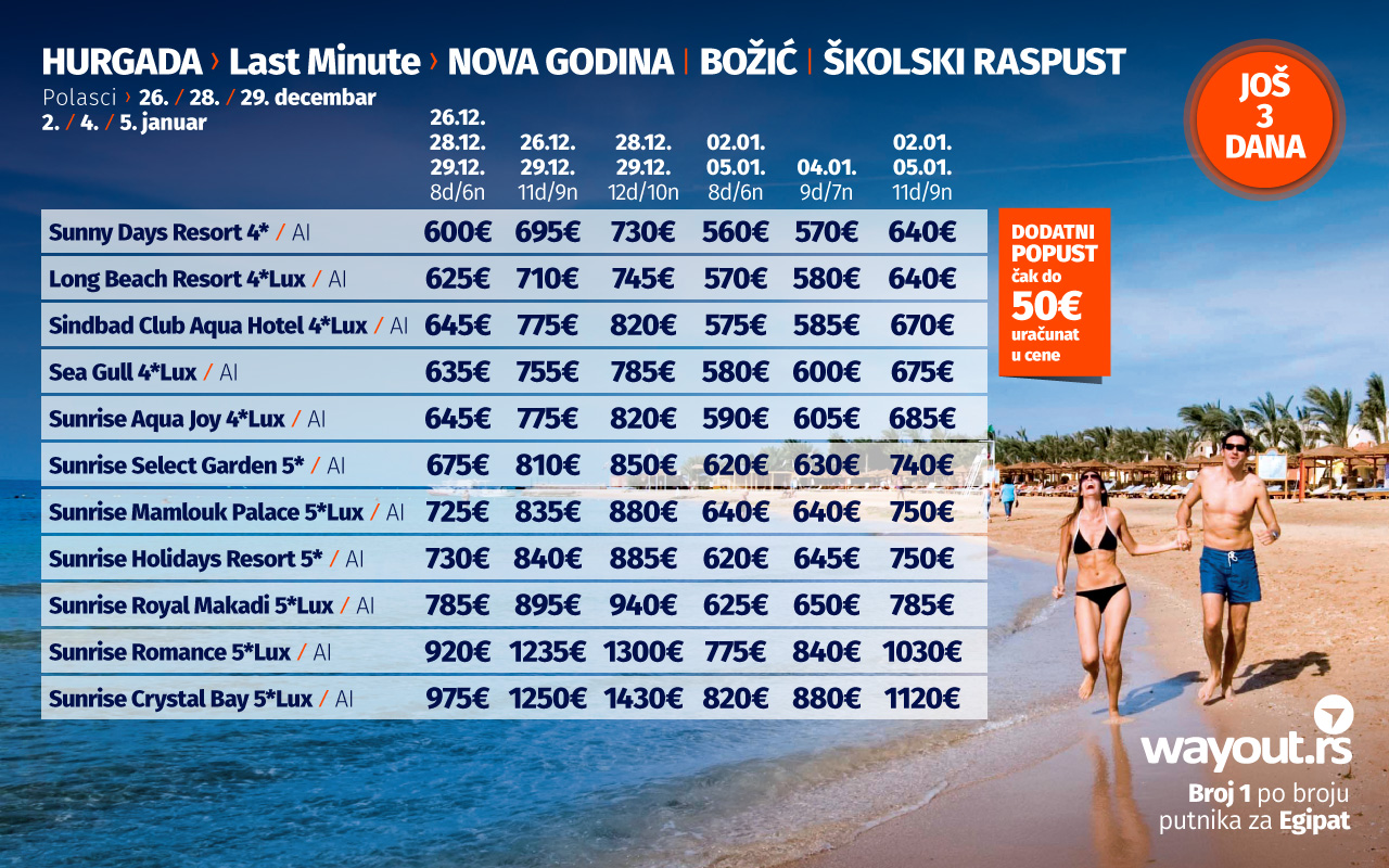 Najsigurnije putovanje sa sigurnim polascima za novogodišnje "zimsko letovanje" je definitivno u Hurgadi. A ukoliko ste mislili da je putovanje u Hurgadu predviđeno samo u letnjim mesecima, Wayout agencija i Sunrise hoteli su tu da promene to mišljenje i predstave "zimsku" ponudu na sunčanim plažama Hurgade.