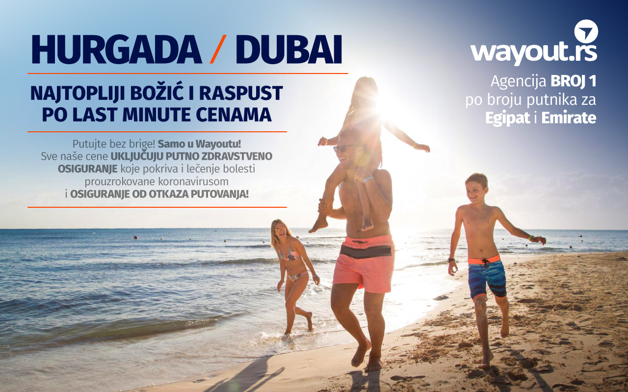 Ako se pitate zbog čega je putovanje u Dubai i Hurgadu Hurgadu preko Wayout agencije definitivno najsigurnije ove godine, osnovni razlog je što Wayout agencija ima najveću ponudu hotela sa najpovoljnijim cenama, a uz sve to, ekskluzivno u Wayoutu, svi putnici u cenu aranžmana imaju uključenu polisu putnog zdravstvenog osiguranja koje pokriva i lečenje Covid-19 i polisu otkaza aranžmana u slučaju nepredviđenih zdravstvenih okolnosti, a sve to u saradnji sa dugogodišnjim partnerima iz kompanije Dunav osiguranje.