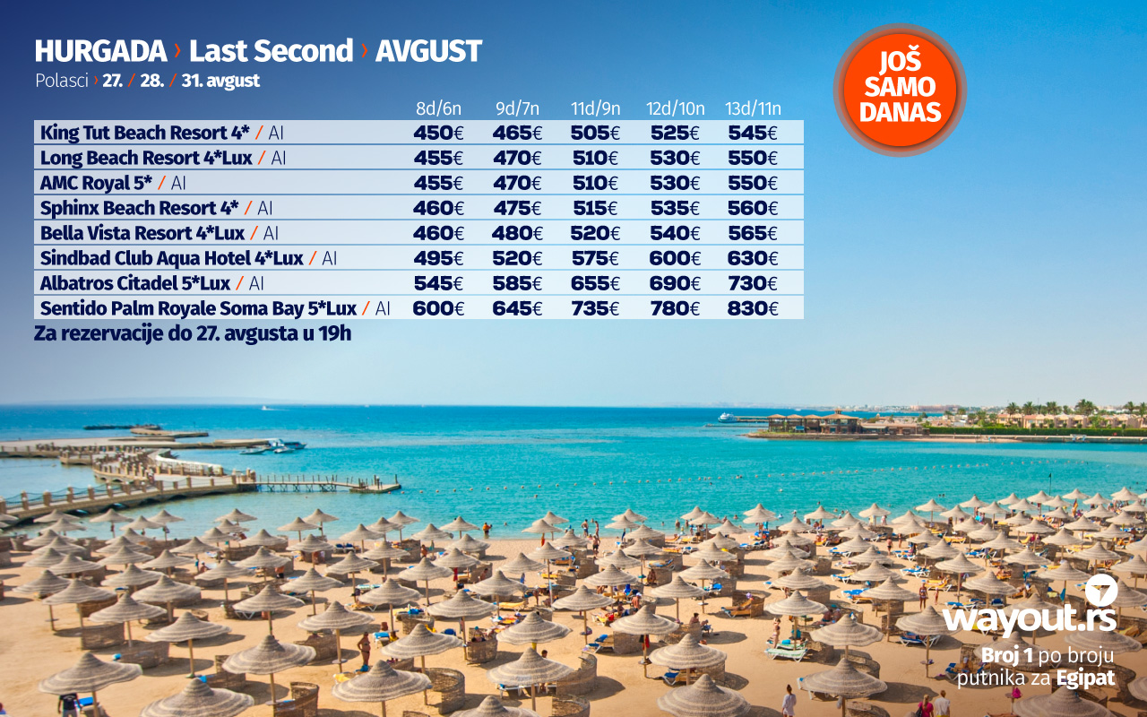 Ukoliko još uvek niste stigli da rezervišete svoje putovanje, bez mnogo razmišljanja, definitvno, najsigurniji i najpovoljniji izbor ovog leta i jeseni je Hurgada i odmor na prelepim plažama Crvenog mora, a za sve one koji bi da što pre pobegnu od svakodnevnih obaveza, spremili smo neodoljive last minute ponude za putovanja u septembru.