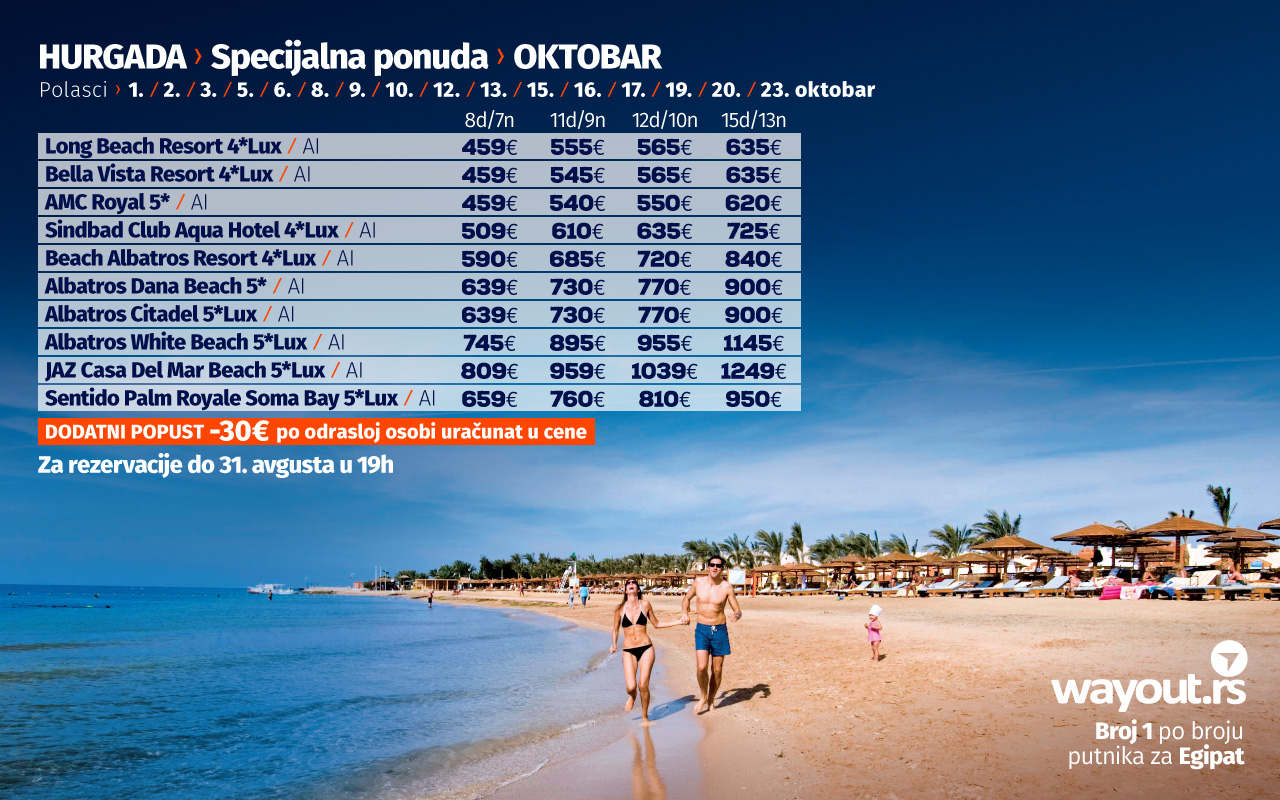 Pošto leto u Hurgadi traje tokom cele godine, za sve putnike smo spremili vrelu letnju rasprodaju za najsigurnije jesenje putovanje, a koja obuhvataspecijalnu ponudu za polaske u oktobru, kao i Ultra First Minute ponudu za polaske u novembru i decembru, sa najpovoljnijim cenama aranžmana do sada i sa najvećim izborom hotela na tržištu. S obzirom na to da će Hurgada i u narednim mesecima biti jedna od glavnih svetskih turističkih destinacija, svima preporučujemo da se što pre odluče za željeni termin i željeni hotel, kako bi svoj aranžman bukirali pre putnika iz ostalih evropskih zemalja kao što su Nemačka, Rumunija, Češka, Poljska, Ukrajina, Rusija...