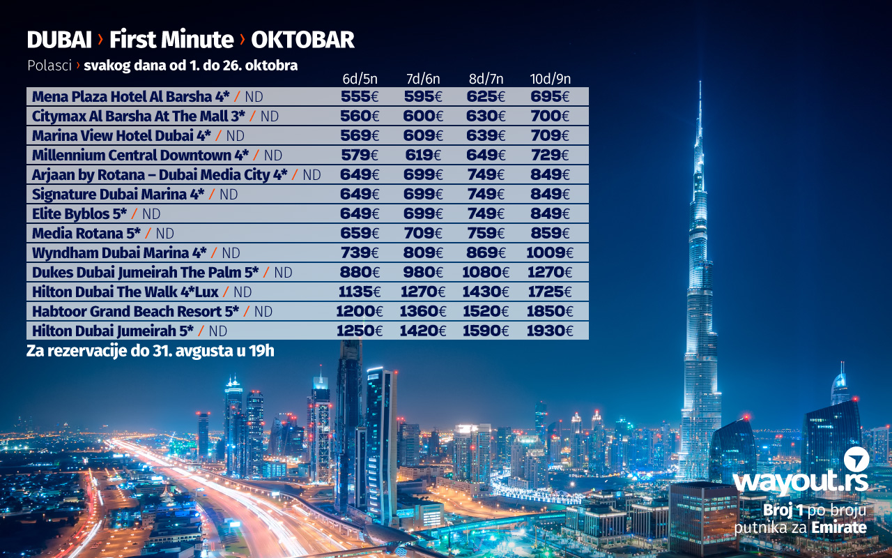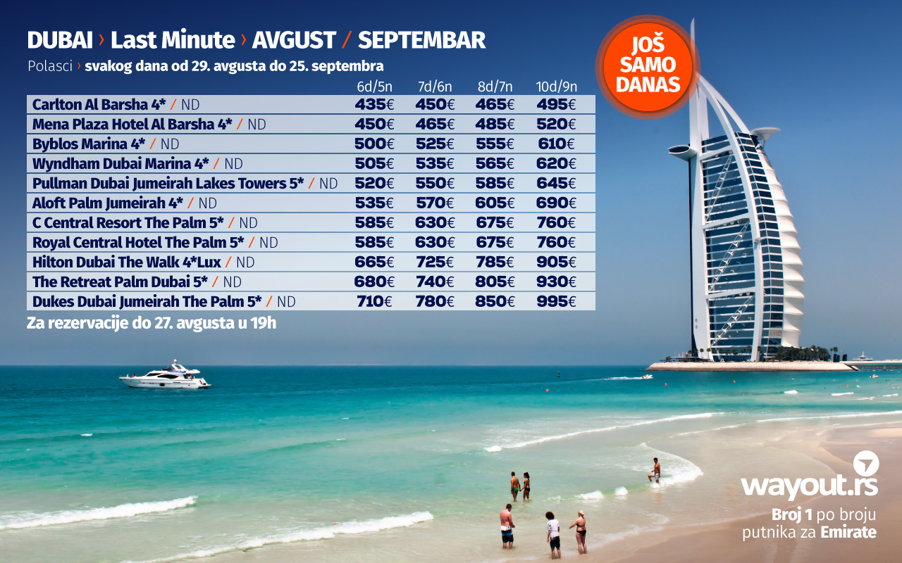 Kao što ste navikli prethodne jeseni i zime, uz neizbežan odmor na divnim plažama Arabijskog zaliva, preporučujemo putovanje u Dubai u septembru i oktobru. Za naše putnike smo izdvojili neke od najpopularnijih hotela sa najpristupačnijim cenama, a Dubai svakako važi za jednu od najsigurnijih i najorganizovanijih destinacija koje su se među prvima oporavile i nastavile normalno funkcionisanje nakon pandemije, a ako ste navikli da svoje putovanje u Dubai rezervišete preko turističkih portala, proverite naše paket aranžmane koji uključuju avio karte, transfere na destinaciji, smeštaj u vrhunskim hotelima, kao i usluge licenciranog vodiča na srpskom jeziku i uverite se u to da su naše cene najpovoljnije uz maksimalno kvalitetnu uslugu.