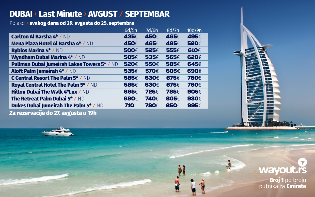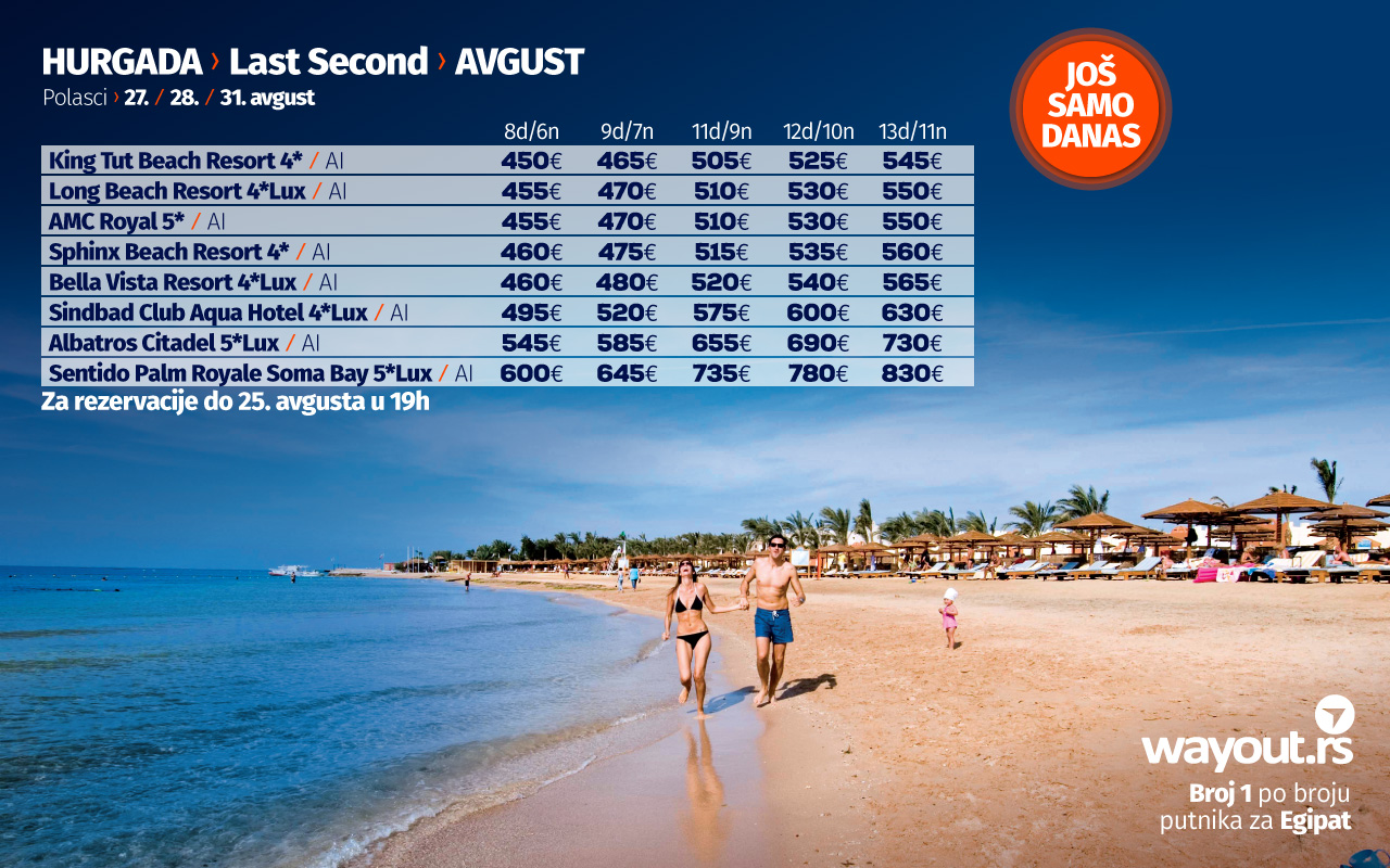 Za sve one koji bi što pre da pobegnu od gradske gužve i lošeg vremena koje se najavljuje u narednom periodu, Wayout agencija je obezbedila dodatna mesta na polascima 27. / 28. / 31. avgusta u najpopularnijim hotelima, a ova poslednja mesta na letovima možete rezervisati po najpovoljnijim cenama, a obzirom na to da je u pitanju veoma limitiran broj mesta, savetujemo da nas svi zainteresovani kontaktiraju što pre kako bi zauzeli svoje mesto, prvo u avionu, a zatim na plaži.