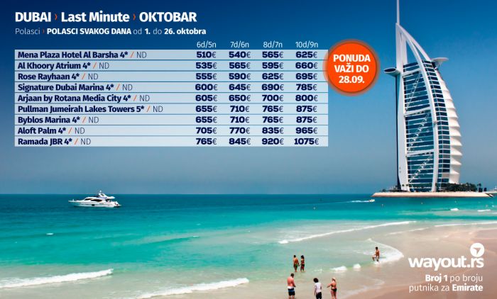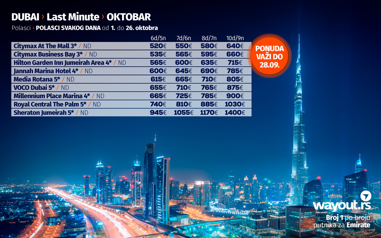Jedan od pokazatelja da je Hurgada jedna od najsigurnijih turističkih destinacija, kao i iskustva putnika koji su prošle godine, u vreme pandemije putovali u Egipat, jeste to da su pojedini hoteli već izašli sa ponudom za polaske u novembru i decembru, a mi smo za sve naše putnike izdvojili najtraženije hotele po specijalnim Ultra First Minute cenama, a obzirom da je tražnja za putovanjima u Hurgadu ogromna, savetujemo da na vreme rezervišete svoje mesto i bez stresa sačekate svoje jesenje putovanje u novembru ili decembru sa najpovoljnijim cenama./ /Kao što ste navikli prethodne jeseni i zime, uz neizbežan odmor na divnim plažama Arabijskog zaliva, preporučujemo putovanje u Dubai u oktobru po nikad povoljnijim LAST MINUTE cenama.