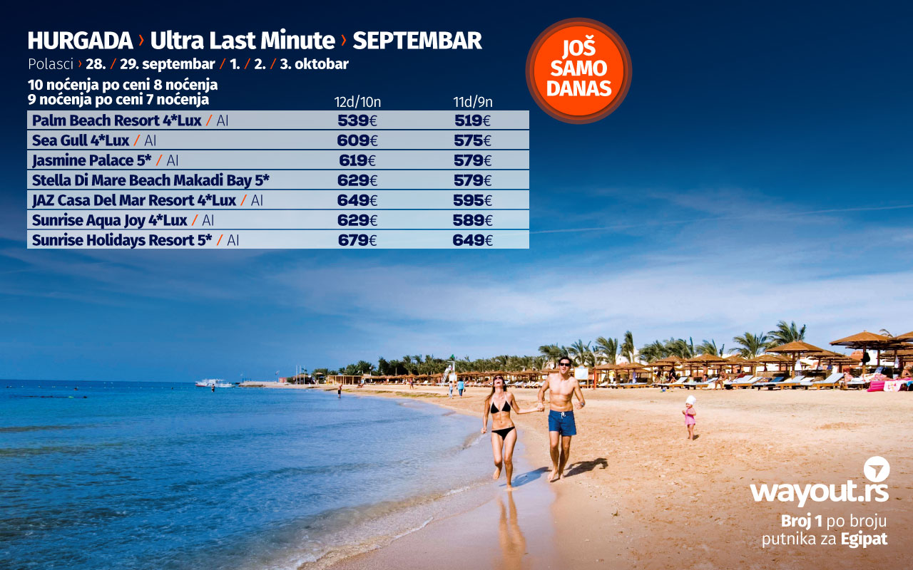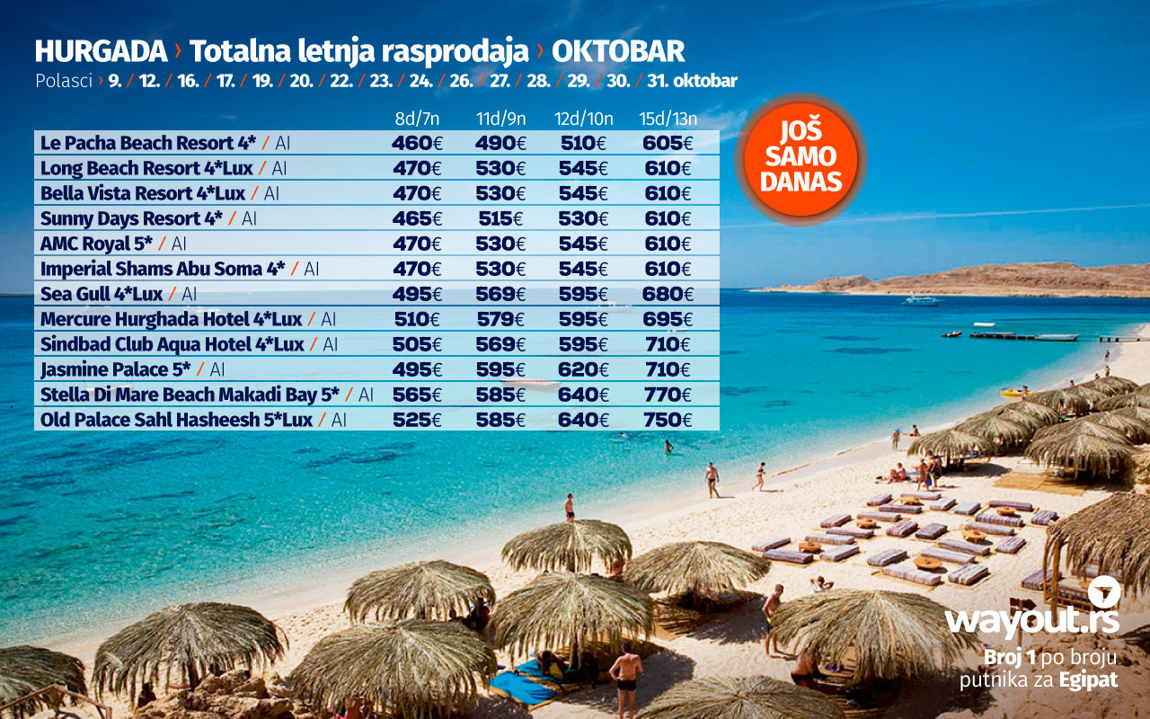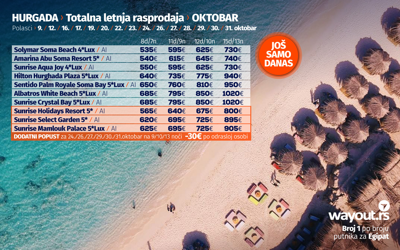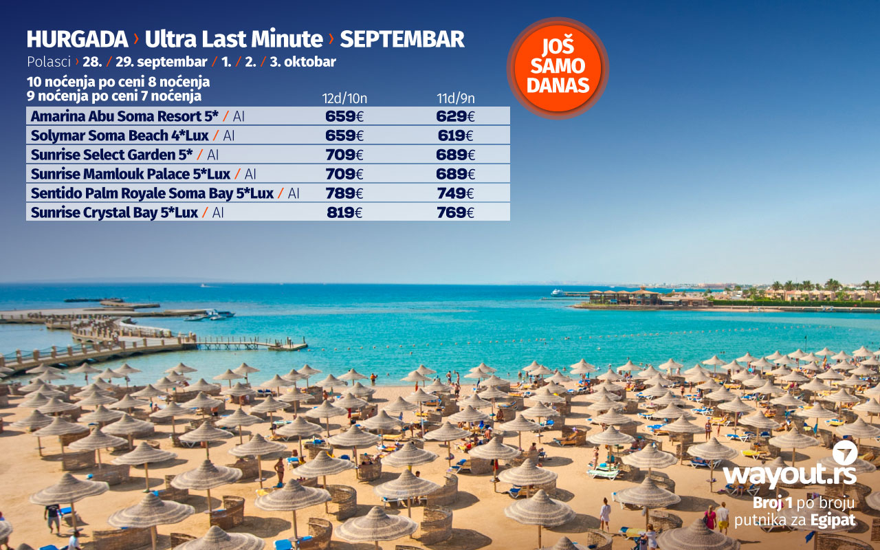 Ukoliko još uvek niste stigli da rezervišete svoje putovanje, bez mnogo razmišljanja, definitvno, najsigurniji i najpovoljniji izbor ove jeseni je Hurgada i odmor na prelepim plažama Crvenog mora, a za sve one koji bi da što pre pobegnu od svakodnevnih obaveza, spremili smo neodoljivu ponudu u vidu TOTALNE LETNJE RASPRODAJE za period putovanja u septembru i oktobru//, sa posebnim akcentom na ULTRA LAST MINUTE ponudu za polaske 28. / 29. septembra (uz dodatni popust za ova dva polaska u iznosu od 30e po odrasloj osobi) i 02. / 03. oktobra.