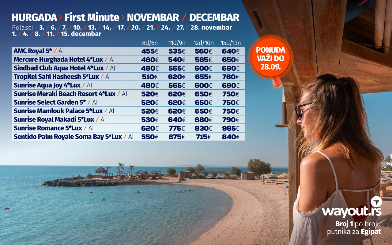 Takođe, posebno bismo napomenuli i novitet u Wayout ponudi, a to su aranžmani za Mini odmor u Hurgadi, bazirani na 8 dana / 7 noćenja u oktobru, sa polascima 9. / 16. / 23. / 30. oktobra u saradnji sa nacionalnom avio kompanijom Air Serbia kojoj dugujemo veliku zahvalnost na besprekornoj saradnji, a pre svega su ovi aranžmani namenjeni putnicima koji žele na kratko da odu iz grada ili jednostavno nemaju dovoljno slobodnih dana od godišnjeg odmora.