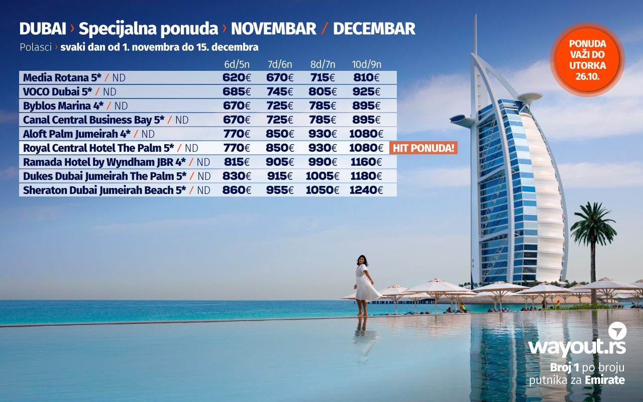 Kao što ste navikli prethodne jeseni i zime, uz neizbežan odmor na divnim plažama Arabijskog zaliva, preporučujemo putovanje u Dubai u novembru i decembru po nikad povoljnijim cenama. Za naše putnike smo izdvojili neke od najpopularnijih hotela sa najpristupačnijim cenama, a Dubai svakako važi za jednu od najsigurnijih i najorganizovanijih destinacija koje su se među prvima oporavile i nastavile normalno funkcionisanje nakon pandemije, a ako ste navikli da svoje putovanje u Dubai rezervišete preko turističkih portala, proverite naše paket aranžmane koji uključuju avio karte, transfere na destinaciji, smeštaj u vrhunskim hotelima, kao i usluge licenciranog vodiča na srpskom jeziku i uverite se u to da su naše cene najpovoljnije uz maksimalno kvalitetnu uslugu.