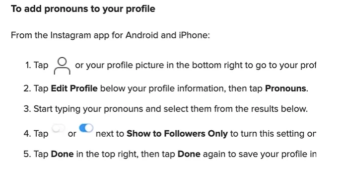 Čini se da Instagram ima opsežnu listu osim uobičajenih zamenica ona/ona, on/on i oni/oni. Druge opcije zamenica na listi uključuju xe/xem/xyr, ze/hir/hirs, thon/thons, ey/em/eir, fae/faer/faers i mnoge druge. Ako ne pronađete svoju zamenicu, korisnik može podneti zahtev Instagramu. Ako opcija zamenica nije dostupna na vašem uređaju (mora imati najnovije ažuriranje na Instagramu), aplikacija predlaže uključivanje vaših zamenica u biografiju.