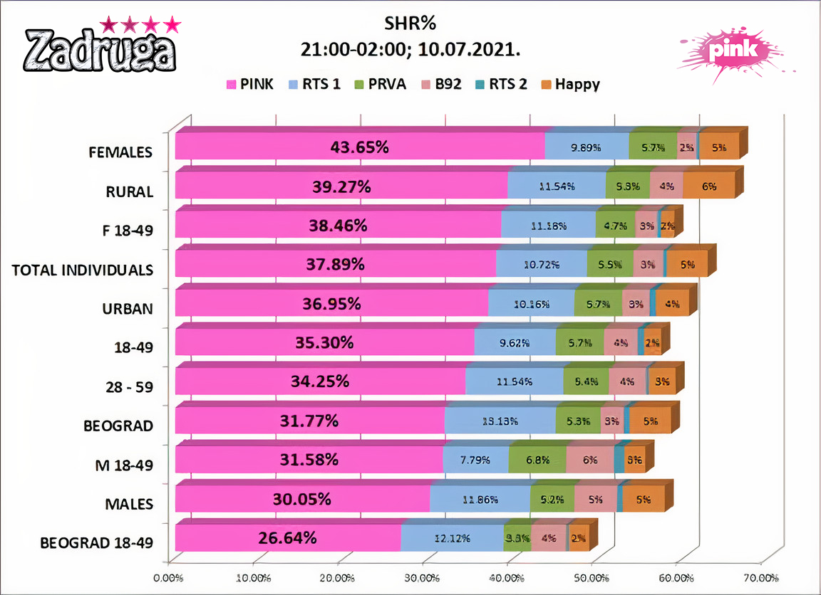 Da je ovog vikenda sve bilo u znaku "Zadruge 4" govore i impresivne brojke - prema jedinim zvaničnim rezultatima merenja gledanosti agencije Nilsen, tokom sva tri dana vikenda "Zadruga" je bila ubedljivo najgledaniji format, a superfinale je u subotu zauzelo neprikosnoveno 1. mesto na listi najgledanijih emisija u danu. U periodu od 21 čas do dva ujutru uz televiziju Pink je tokom superfinalne noći bilo 38 odsto auditorijuma, odnosno neverovatnih 1.500.000 gledalaca. Od dva ujutru, pa sve do proglašenja pobednika u šest ujutru, uz "Zadrugu 4" i televiziju Pink bilo je čak 52 odsto auditorijuma. To znači da je svaki drugi gledalac bio uz završnicu najgledanijeg rijalitija na ovim prostorima.