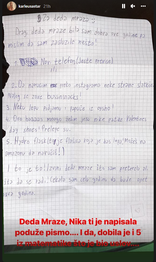 Kako je navela Jelena, Nika je dobila 5 iz matematike, što je ujedno bio uslov za novogodišnje želje.
