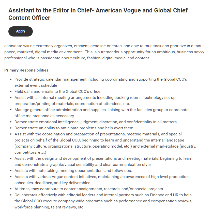 Magazin ''Vogue'' je objavio listu obaveza koje će budući asistent glavnog i odgovornog urednika- Ane Vintur, morati da obavlja.