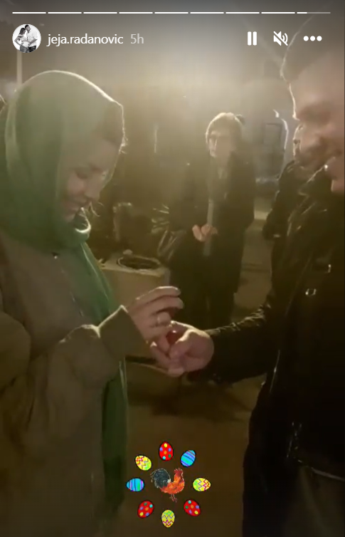 Jelena Radanović je sada pokazala i kako je izgledalo sinoćno kucanje jajima sa suprugom, u crkvi Lazarici u Beogradu, na liturgiji. Jelena je imala maramu na glavi tom prilikom, a na Instagramu objavila je snimak ovog običaja, u kom je uz osmeh Sloba pobedio, polomivši njeno jaje.