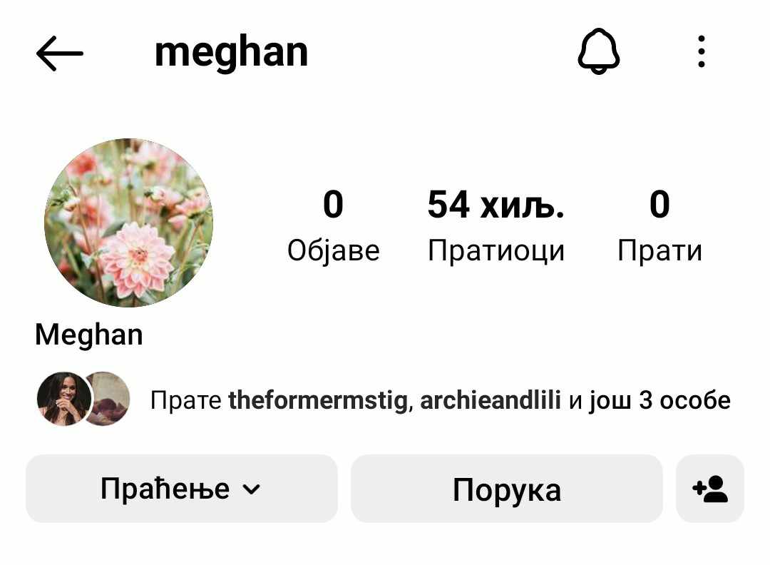 To je javni nalog @meghan, koji nema još ni jednu objavu, a na naslovnoj strani se nalazi slika cveća.