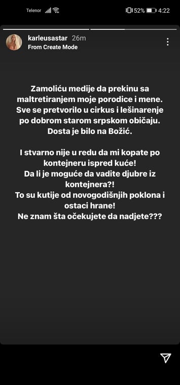 - Zamoliću medije da prekinu sa maltretirajem moje porodice i mene. Sve se pretvorilo u cirkus i lešinarenje po dobrom srpskom običaju. Dosta je bilo na Božić. I stvarno nije u redu da mi kopate po kontejneru ispred kuće! Da li je moguće da vadite đubre iz kontejnera?! To su kutije od novogodišnjih poklona i ostaci hrane. Ne znam šta očekujete da nađete?!"- stoji u objavi popularne dive.