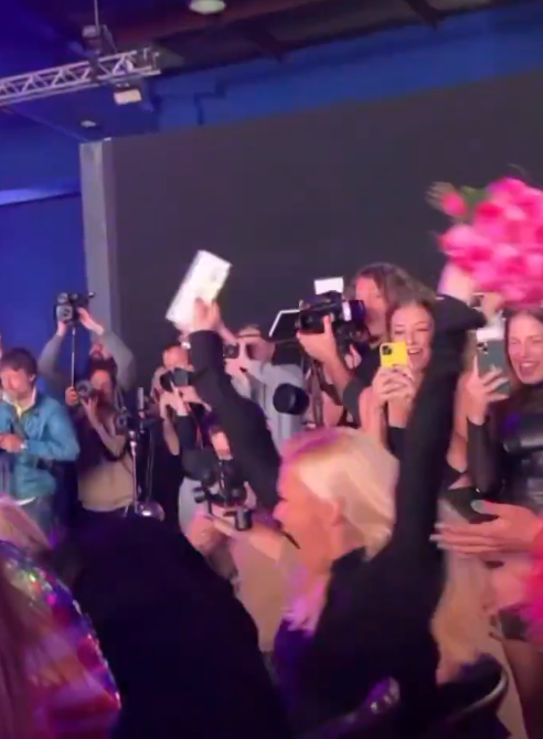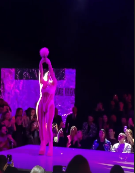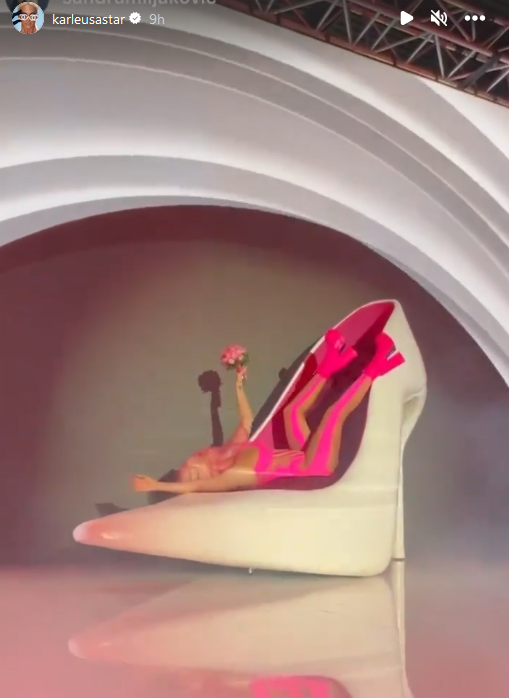 Jelena Karleuša je napravila pravi spektakl na jednoj modnoj reviji. Ona je izašla na pistu u krevetu u obliku štikle, što je bio prizor za pamćenje. Pevačica je bila obučena u roze kombinezon koji je bio veoma zanimljivo sečen. Nosila je cipele sa debelom štiklom u istoj nijansi. U ruci je sve vreme nosila cveće,a nikome nije bilo jasno koja je njegova svrha.