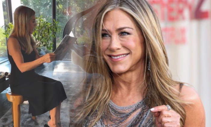 Na snimku Aniston nosi crnu haljinu midi dužine, koju je uparila sa nekim avijatičarskim naočarima dok je sedela na stoličici ispred velikog televizora u dnevnoj soibi.