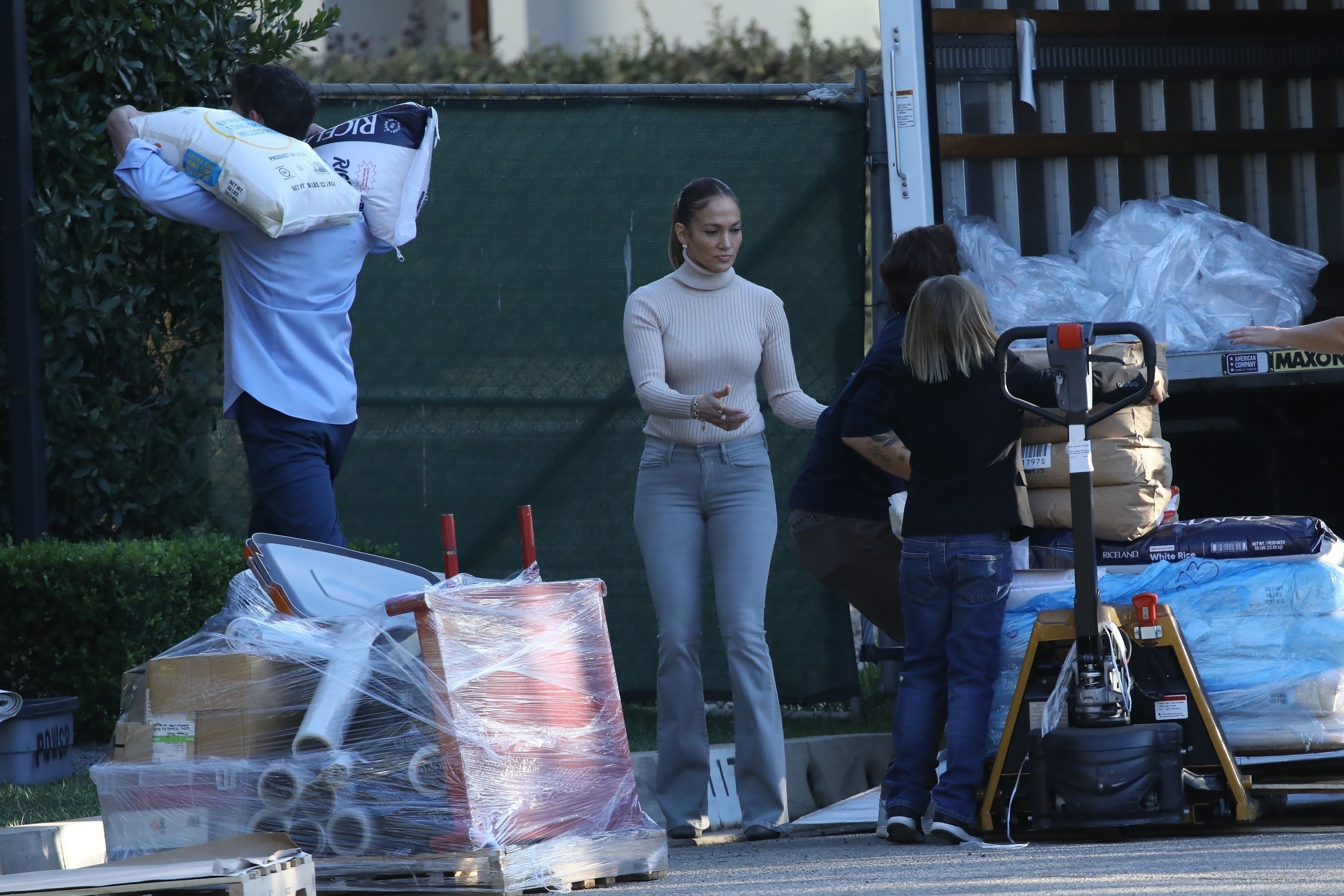 Dženifer visoke potpetice nisu sprečile da završi sve dnevne obaveze. Par je footgrafisan kako istovara kamion i nose džakove hrane onima kojima je potrebno, uz pomoć dvoje Aflekove dece, Semjuela i Serafine i blizancima pevačice, Emom i Maksom.