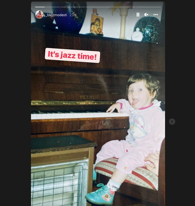Na slici vidimo da ima svega par godina, a da ne nosi roze odelce možda bismo je pobrkali sa dečačićem. Ono što je ostalo isto tokom svih ovih godina su prepoznatljivo plave oči. Anđela je dodala opis "Vreme je za džez", a na slici se nalazi pored klavira. Odatle možemo zaključiti da je, pored glume, i muzika bila njena strast od malih nogu.