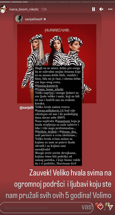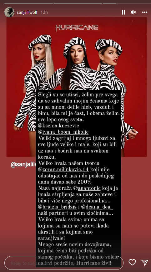 "Slegli su se utisci. Želim pre svega da se zahvalim mojim ženama koje su sa mnom delile hleb, vazduh i binu, bila mi je čast i obema želim sve lepo ovog sveta. Ksenija, Ivana...", napisala je Sanja, pa se obratila i novim "Uragankama".