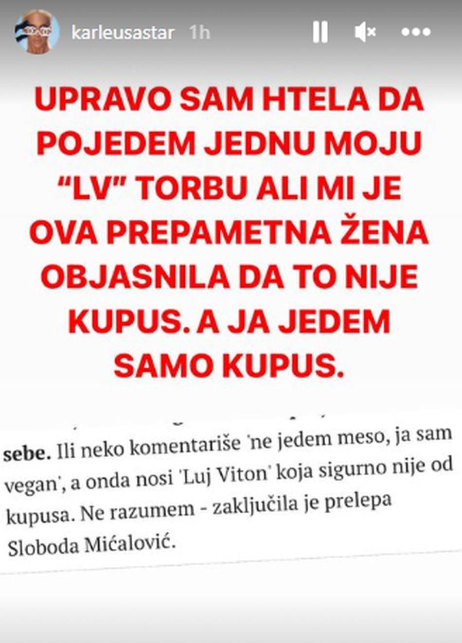 "Upravo sam htela da pojedem jednu moju 'Luj Viton' torbu, ali mi je ova prepametna žena objasnila da to nije kupus. A ja jedem samo kupus", napisala je Karleuša na Instagramu.