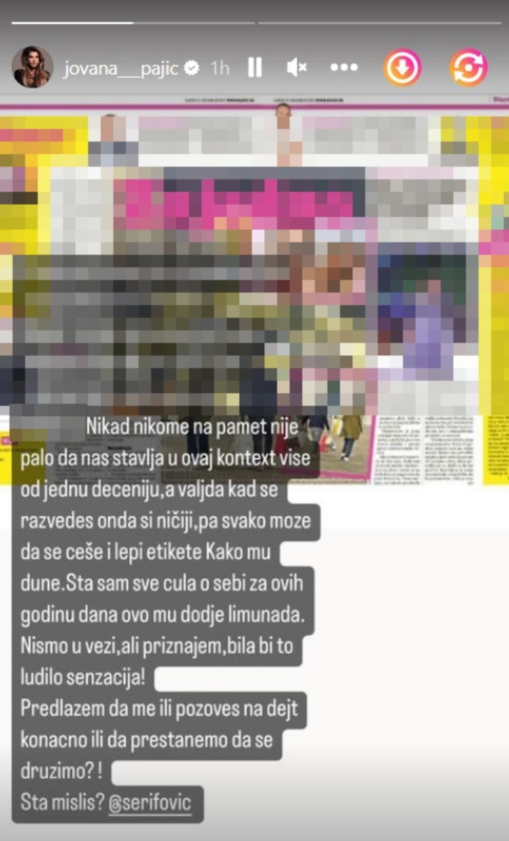 "Nikad nikome na pamet nije palo da nas stavlja u ovaj kontekst više od jednu deceniju, a valjda kad se razvedeš onda si ničiji, pa svako može da se češe i lepi etikete kako mu dune. Šta sam sve čula o sebi poslednjih godinu dana, ovo mu dođe kao limunada. Nismo u vezi, ali priznajem, bila bi to ludilo senzacija! Marija, predlažem da me ili pozoveš na dejt konačno ili da prestanemo da se družimo, šta misliš?", glasila je Jovanina poruka.
