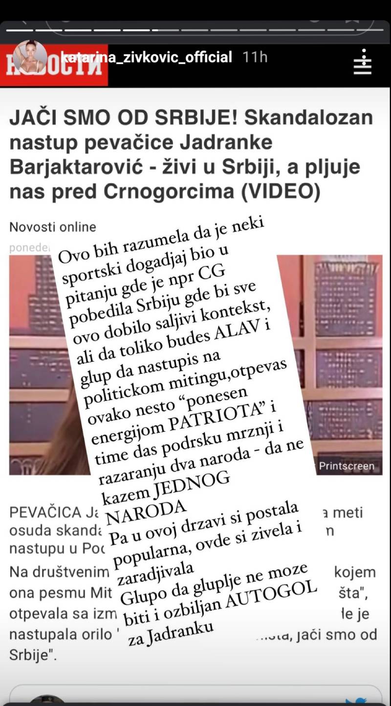 - Ovo bih razumela da je neki sportski događaj bio u pitanju, gde je npr. Crna Gora pobedila Srbiju, gde bi sve ovo dobilo šaljiv kontekst, ali da toliko budeš alav i glup da nastupiš na političkom mitingu, otpevaš ovako nešto "ponesen energijom patriota" i time daš podršku mržnji i razaranju dva naroda, da ne kažem jednog naroda.Pa, u ovoj državi si postala popularna ovde si živela i zarađivala. Glupo da gluplje ne može biti i ozbiljan autogol za Jadranku - napisala je Kaća na svom Instagram storiju. Pogledajte sporni snimak.