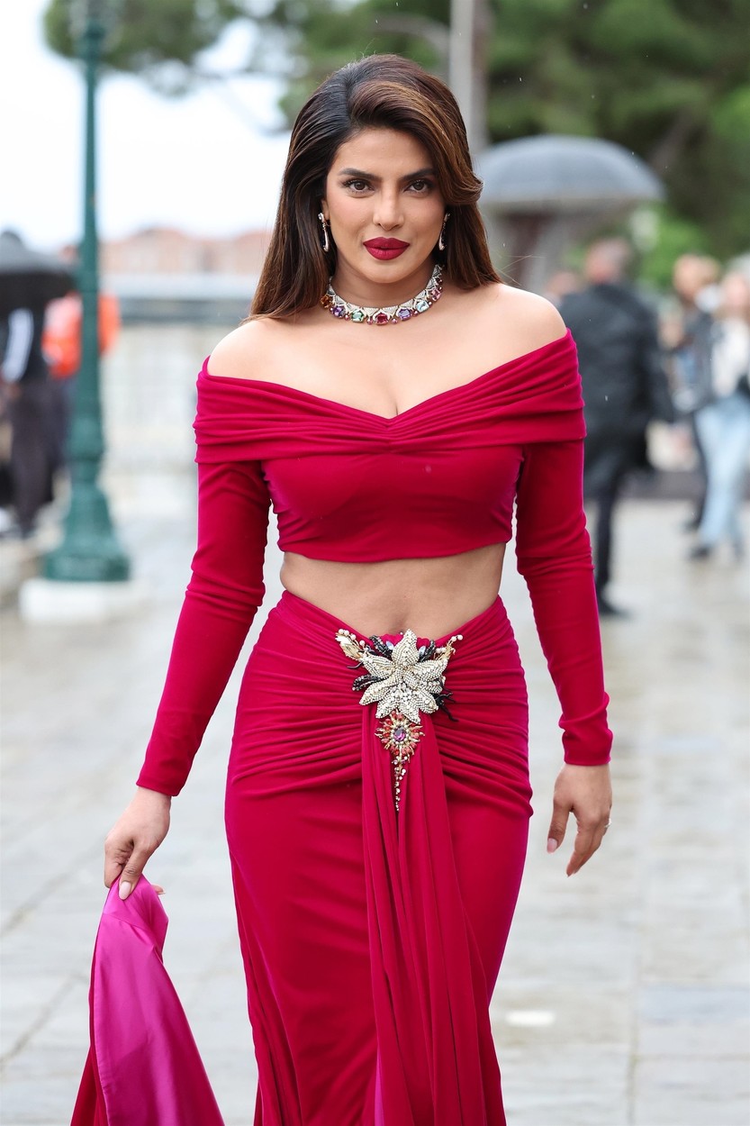 Na žurku je stigla i Prijanka Čopra u kreaciji koja je jasno inspirisana njenim indijskim poreklom i kulturnim nasleđem. Ona je izabrala dvodelni, raskošni komplet u prelepoj boji maline, sačinjen od dugačke suknje sa naborima, te ukrasnom šnalom u obliku cveta od srebrnih i crnih cirkona i kratko sečene, dekoltirane bluze. Lepa 40-godišnjakinja je sve zaokružila crnim, satenskim cipelama sa platformom i Bulgari ogrlicom od drgaog kamenja u različitim bojama.