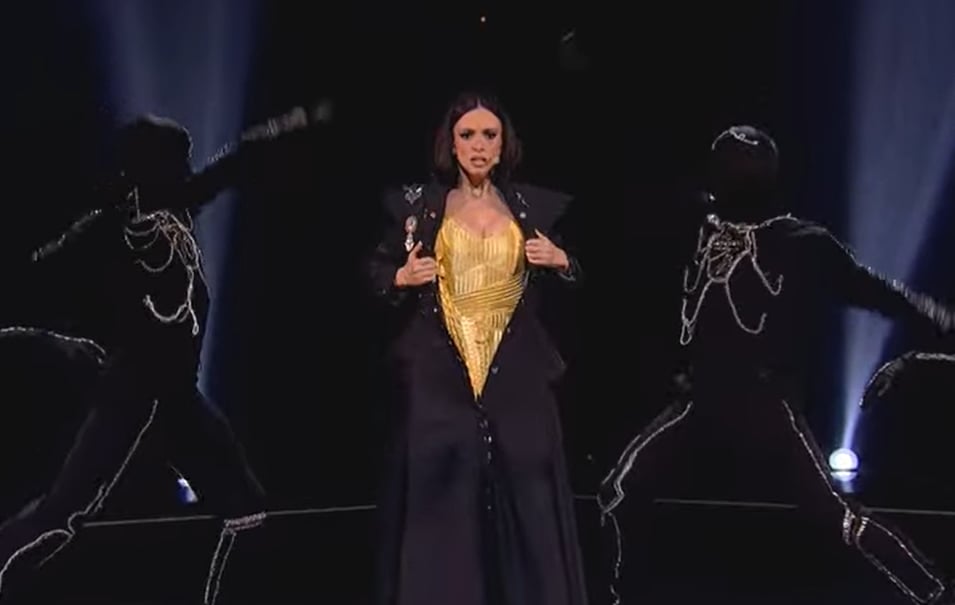 Ona je publiku oduševila svojim nastupom i izgledom. Ona je iznenadila publiku kada je skinula mantil i ostala u zlatnoj haljini. Pored nje su na sceni bila četvorica muškaraca u kostimima koji su tek na kraju otkrili svoja lica.