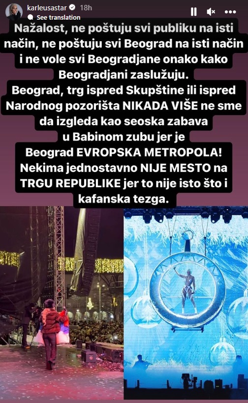 - Nikada nisam sebe poredila sa drugim izvođačima jer je to u svakom smislu neuporedivo, ali sam iskreno šokirana koliko oni koji (ne) zasluženo dobiju priliku da pevaju na Trgu Republike, ne poštuju ni šansu, ni publiku, ni mesto, ni državu. Dobiti priliku da nastupite ispred Skupštine ili na Trgu, velika je čast i odgovornost. Ali umesto da daju sve od sebe da opravdaju poverenje grada, svedoci smo da mnogi pevači jednostavno nikada nisu smeli da dobiju šansu - napisala je Karleuša i iskritikovala još više:
