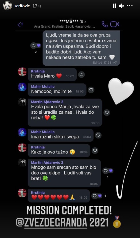 - LJudi, vreme je da se ova grupa ugasi. Još jednom čestitam svima na svim uspesima. Budi dobro i budite dobri ljudi. Ako vam nekada nešto zatreba tu sam - napisala je Marija, a onda je usledilo i brojno negodovanje kandidata.