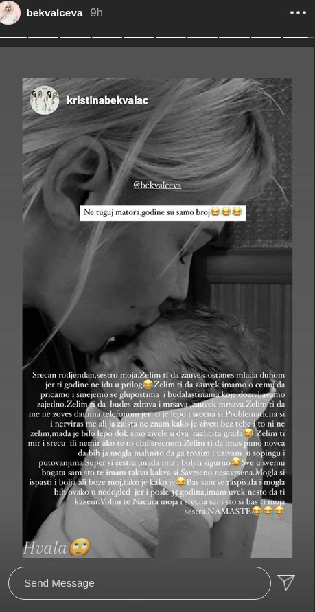 - Želim ti mir i sreću ili nemir ako te to čini srećnom. Želim ti da imaš puno novca da bih ja mogla mahnito da ga trošim i uživam u šopingu i putovanjima. Super si sestra, mada ima i boljih sigurno. Sve u svemu bogata sam što te imam takvu kakva si. Savršeno nesavršena. Mogla si ispasti i bolja, ali Bože moj, tako je kako je. Baš sam se raspisala i mogla bih ovako u nedogled jer i posle 35 godina, uvek imam nešto da ti kažem. Volim te Nacuro moja i srećna sam što si ti moja sestra. Namaste. - napisala je Kristina, a onda je usledio i Natašin odgovor: - Ne tuguj matora, godine su samo broj.