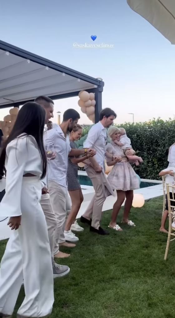Na krštenju su se pojavili i Novak i Jelena sa decom. NJih dvoje nisu skidali osmeh sa lica, a jedan od najupečatljivijih momenata bio je kada su zaigrali kolo koje je povela Saška sa Aleksandrom u naručju.